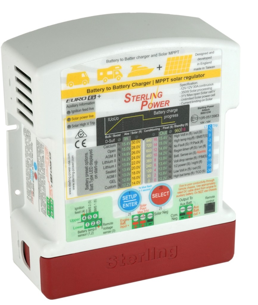 - Lithium batteries, Sterling B2B charger and 230W solar panel. Worked brilliantly and transformed our electrical system so much so that even with the heater, cooker, lights, electric blanket (12v) and chargers running at various times, we were able to park up without running the engine for 3 days at -15°C